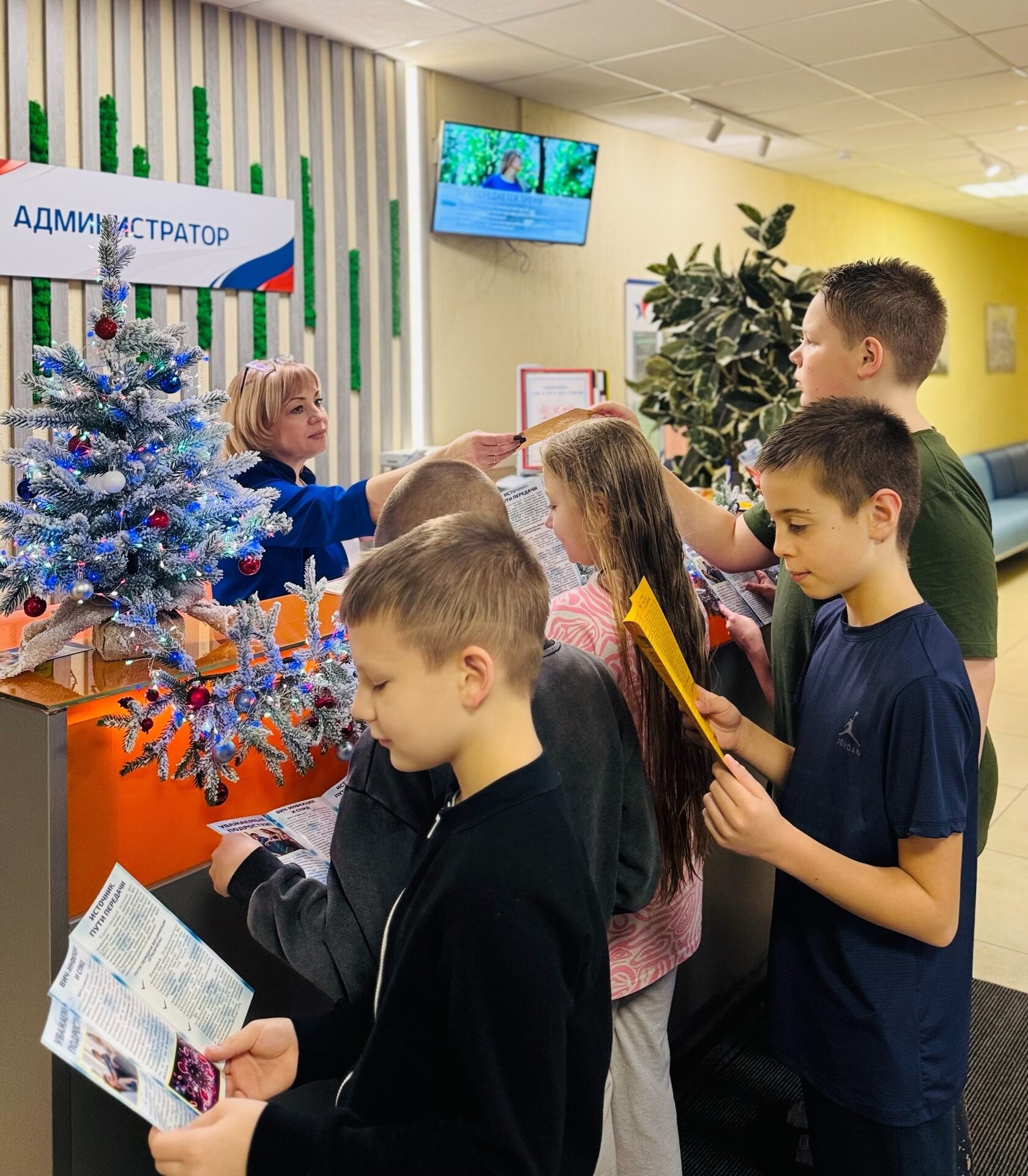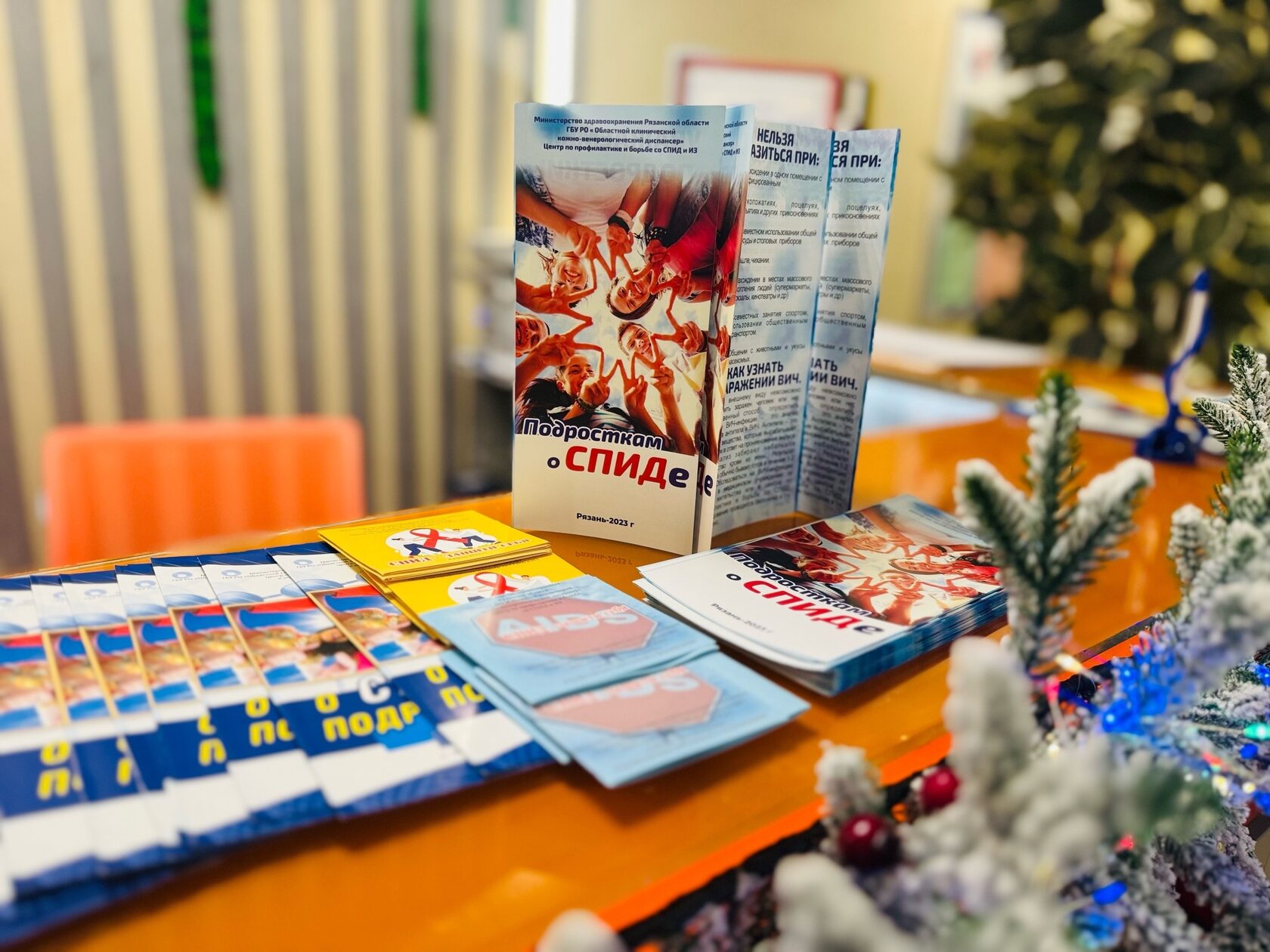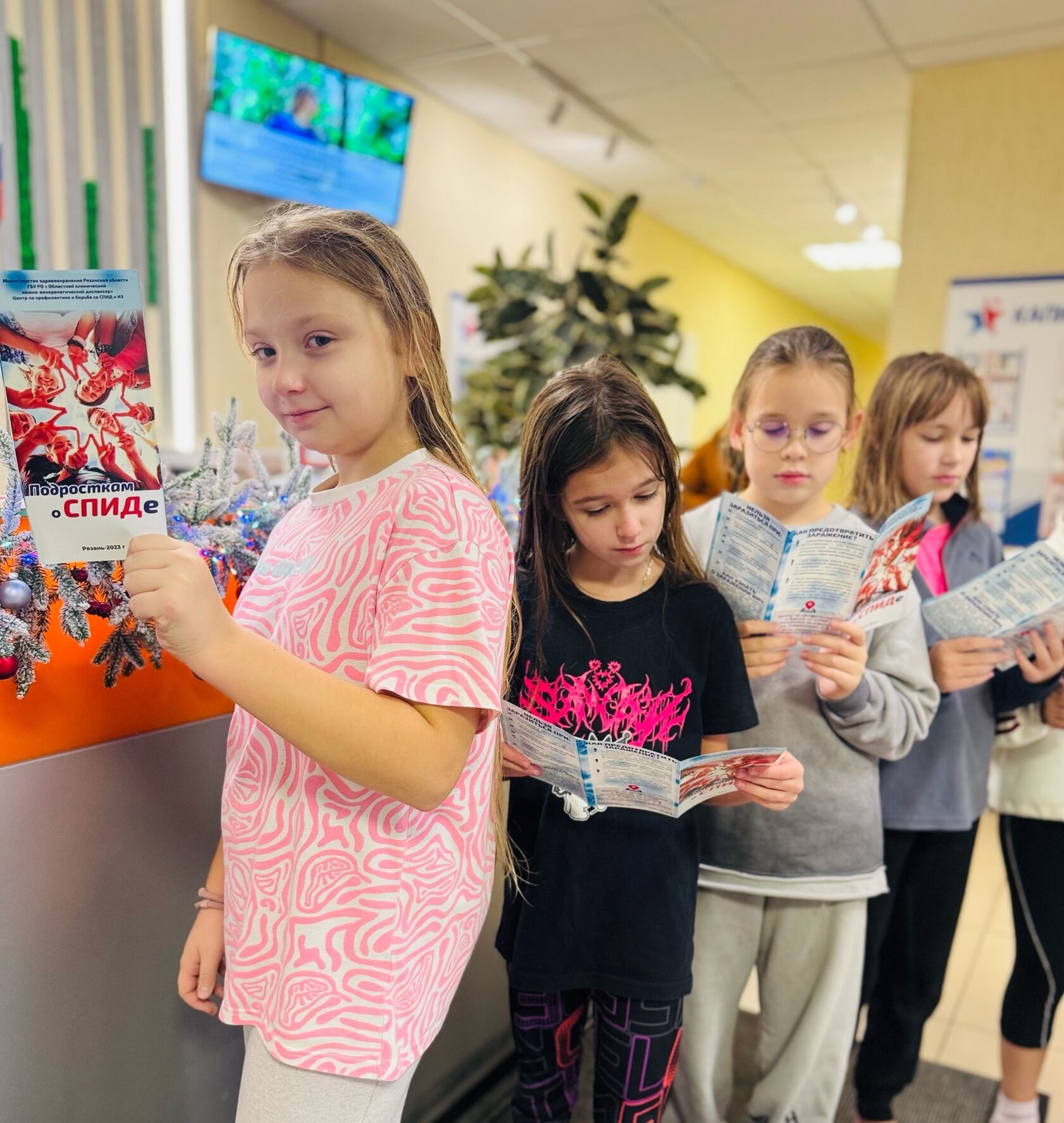 в фойе спорткомплекса, в течении дня, велась трансляция видео-уроков, а в зоне ресепшена, каждый смог получить информационные буклеты, направленные на привлечение внимания к проблеме и формирование толерантного отношения к ВИЧ-позитивным людям.